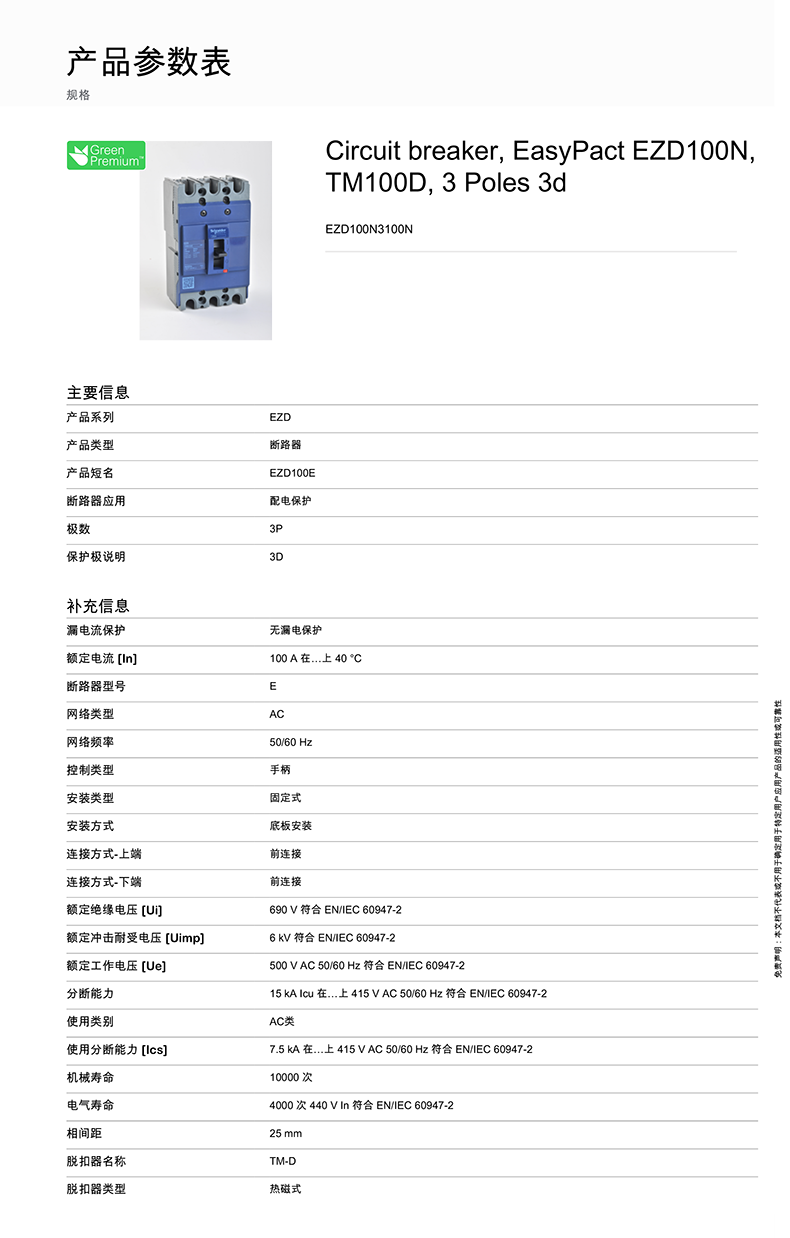 施耐德塑殼斷路器EZD系列配電用固定式斷路器EZD100N3100N產(chǎn)品參數(shù)表2